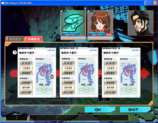 詳細設定では、簡易設定の項目の他に3種類の作戦パターンを設定できます。また、照準の補正を行うことができます。